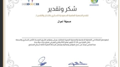 أحوال – جدة – نوال مسلم : كرمت الجمعية العلمية السعودية للسكري صحيفة أحوال بشهادة تقدير – وذلك نظير جهود الصحيفة الإعلامية لإبراز فعاليات ونشاطات الجمعية، ومنها فعاليات وورش ومؤتمر…