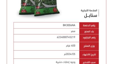أحوال – متابعات – إبتسام عشان : حذّرت الهيئة العامة للغذاء والدواء من استهلاك منتج بامية زيرو المجمدة للعلامة التجارية (سنابل)، الذي يتم إنتاجه في جمهورية مصر العربية، وذلك لوجود…