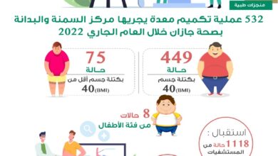 أحوال – جازان – عائشة طاهر: أجرى مركز السمنة والبدانة بمستشفى الأمير محمد بن ناصر بجازان 532 عملية جراحية لتكميم المعدة خلال الفترة من بداية شهر يناير وحتى نهاية شهر…