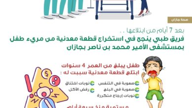 أحوال _ جازان _ عائشة طاهر: قالت صحة جازان بأن أطباء الأنف والأذن والحنجرة بمستشفى الأمير محمد بن ناصر نجحوا في استخراج قطعة معدنية من مريء طفل بعد سبعة أيام…
