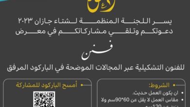 أحوال – جازان – عبدالله مشهور : بدأت اللجنة المنظمة لمهرجان شتاء جازان 2023 اليوم، استقبال مشاركات المبدعين والمبدعات الراغبين في المشاركة بمعرض “فنن”، في مجالات الفنون التشكيلية والخط العربي…