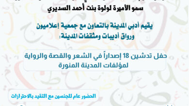 أحوال – المدينة المنورة – سامية الصالح : ترعى حرم صاحب السمو الملكي أمير منطقة المدينة المنورة سمو الأميرة لولوة بنت أحمد السديري تدشين 18 إصدار أدبي نسائي في الرواية…