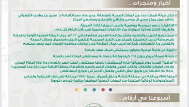 عبير الغامدي أشارت الإحصائية الأسبوعية لمستشفيات صحة الباحة خلال الأسبوع الماضي عن استقبال أقسام الطوارئ 7115 حالة . بينما استقبلت العيادات الخارجية 7991 مراجعا . وبلغ عدد المنومين 1381 مريضا…
