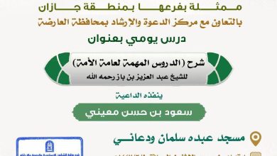 أحوال – العارضة – عبدالله مشهور ينفذ فرع وزارة الشؤون الإسلامية والدعوة والإرشاد في منطقة جازان ممثلا بمركز الدعوة بمحافظة العارضة سلسلة من المناشط الدعوية والدرس العلمية تنطلق في اليوم…