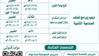 أحوال – صبيا – بندر معشي: أعلن المعهد الصناعي الثانوي بمحافظة صبيا بمنطقة جازان عن فتح باب القبول إلكترونياً للفصل التدريبي الأول لعام ١٤٤٣ – ١٤٤٤هـ، وذلك بدءاً من ٢٥…