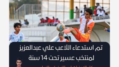 أحوال – أبها – عايض الربعي :. تم استدعاء اللاعب الواعد علي عبدالعزيز لمنتخب عسير الإقليمي تحت ١٤ سنه وذلك لخوض منافسات بطولة المملكة لمنتخبات المناطق تحت 14/ 13 سنة…