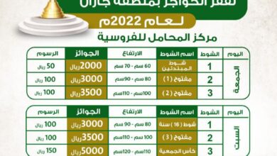 أحوال- جازان- عائشة طاهر: تنطلق مساء اليوم بطولة كأس جمعية فرسان لقفز الحواجز بمنطقة جازان لعام 2022 م، والمقامة بمركز المحامل للفروسية بمحافظة أحد المسارحة بإشراف من الاتحاد السعودي للفروسية،…