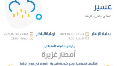 أحوال – محمد صالح الزهراني في تنبيه من المركز الوطني للأرصاد اليوم من هطول أمطار غزيرة على منطقة جازان باذن الله تعالى يصاحبها رياح شديدة السرعة مع انعدام في مدى…