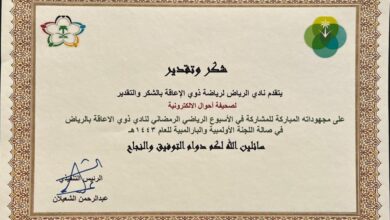أحوال تحصل على شهادة شكر وتقدير من نادي الرياض لذوي الإعاقة
