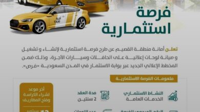 أحوال – متابعات – إبتسام عشان : طرحت أمانة منطقة القصيم ممثلة في الإدارة العامة للاستثمار, فرصة استثمارية لإنشاء وتشغيل وصيانة لوحات إعلانية على الحافلات وسيارات الأجرة بمدينة بريدة، وذلك…