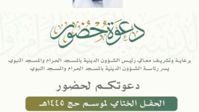 أحوال – مكة المكرمة – نوال مسلم:. تقيم رئاسة الشؤون الدينية بالمسجد الحرام والمسجد النبوي يوم الخميس القادم بمقر الرئاسة؛ بمكة المكرمة، الحفل الختامي لموسم حج هذا العام ١٤٤٥ هجرية؛…