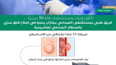 أحوال- جازان- عائشة طاهر: قالت الصحة في جازان بأن أطباء الجراحة العامة بمستشفى العيدابي العام تمكن من انهاء معاناة عشرينية وذلك بأجراء عملية اصلاح للفتق السري بواسطة جهاز المنظار الجراحي…