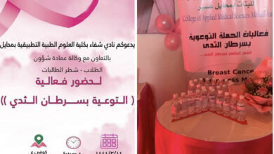 أحوال – عسير- فاطمة الغربي: أقام نادي شفاء بكلية العلوم الطبية التطبيقية بمحايل فعالية التوعية بسرطان الثدي المقام بكوفي عين المختصة ، وكان بإشراف عميدة الكلية الصحية التطبيقية الدكتورة نورة…