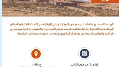 أحوال – الجوف يحيى علي عسيري: دعا المركز الوطني للوقاية من الآفات النباتية والأمراض الحيوانية ومكافحتها “وقاء” بمنطقة الجوف عموم المواطنين والمقيمين والمزارعين ومربي الماشية والنحالين إلى الابتعاد عن مواقع…