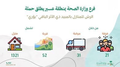 أحوال – عسير– محمد العزي أطلق فرع وزارة الصحة بمنطقة عسير، عبر إدارة مكافحة نواقل المرض والأمراض المشتركة، حملة رش بؤري تستهدف 52 قرية في المنطقة، وتستمر لمدة 5 أيام…