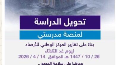 أحوال – القصيم – معدي آل حيه أعلنت الإدارة العامة للتعليم بمنطقة القصيم عن تحويل الدراسة الحضورية إلى التعليم عن بُعد ليوم غدٍ الخميس 28-10-1447هـ، وذلك بناءً على التقارير الواردة…