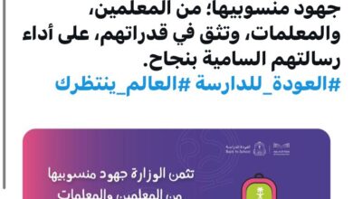 يعود غدًا أكثر من 8000 معلم ومعلمة بتعليم الحدود الشمالية في قرابة 500 مدرسة، بجميع المراحل الدراسية، “بنين وبنات ” وذلك استعدادًا لبداية العام الدراسي 1445 هـ، واستقبال طلاب التعليم…