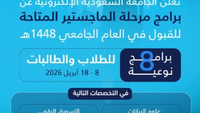 أحوال – عبد الله صالح الكناني أعلنت الجامعة السعودية الإلكترونية موعد فتح باب القبول للراغبين في الالتحاق ببرامج الماجستير الأكاديمية والتنفيذية للعام الجامعي 1448هـ، وذلك عبر بوابة القبول الموحدة في…