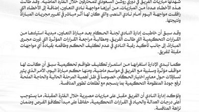 أحوال ـ الرياض ـ طارق العريدي أبدى مجلس إدارة نادي الشباب استياءه الشديد من تكرار الأخطاء التحكيمية التي طالت الفريق في مباريات دوري روشن السعودي، مؤكدًا أن تلك القرارات كان…