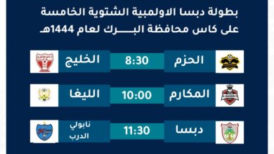أحوال – البرك – إبراهيم الروسي: تنطلق اليوم الخميس ١٤٤٤/٥/٢١ بطولة دبسا الأولمبية الشتوية الخامسة على كأس بلدية محافظة البرك بمشاركة 21 فريق تم توزيعها إلى سبع مجموعات كل مجموعة…
