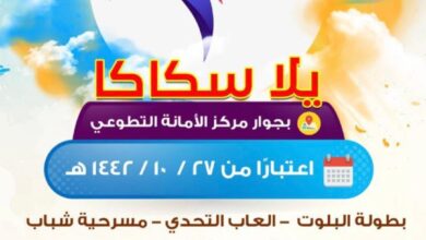 اعلن مكتب وزارة الرياضة بمنطقة الجوف عن إقامة برنامج ترويحي تحت مسمى يلا سكاكا، خلال الفترة من ٢٧ شوال حتى ١ ذي القعدة ،و يشمل عدد من الفعاليات الترويحية والتنشيطية…
