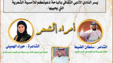 أحوال- عسير- وسام حمدي: يستهل النادي الأدبي الثقافي في منطقة الباحة الثلاثاء المقبل الموافق 27-12-1443ه نشاطه الصيفي بأمسية (أمراء الشعر) وذلك ضمن فعاليات صيف الباحة ١٤٤٣. حيث سيشارك أمير الشعراء…