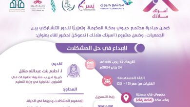 أحوال – مكة المكرمة – نوال مسلم: ضمن مبادرة مجتمع حيوي بمكة المكرمة، وتعزيزًا للدور التشاركي بين الجمعيات، وضمن مشروع أسرتك ملاذك يقام لقاء بعنوان ( الإبداع في حل المشكلات)…