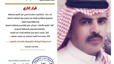 أحوال – عسير – علي عسيري: أصدر المدير الإقليمي لصحيفة أحوال الإلكترونية بالمنطقة الجنوبية الأستاذة فاطمة محمد الغربي مساء الإثنين قراراً يقضي بتكليف الأستاذ عامر آل عامر نائبًأ لمدير العلاقات…