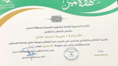 أحوال – رجال ألمع – عامر آل عامر : حصلت الأستاذة حبيبة محمد عامر من منسوبي القطاع الصحي في رجال ألمع، على شهادة التميز على مستوى الشؤون الصحية بمنطقة عسير…