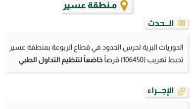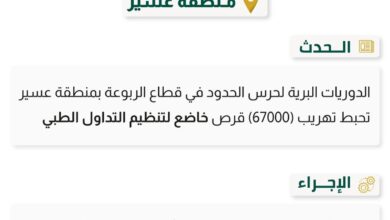 أحوال – متابعات التحرير أحبطت الدوريات البريّة لحرس الحدود في قطاع الربوعة بمنطقة عسير تهريب (67,000) قرص خاضع لتنظيم التداول الطبي، وجرى استكمال الإجراءات النظامية الأولية، وتسليم المضبوطات لجهة الاختصاص.…