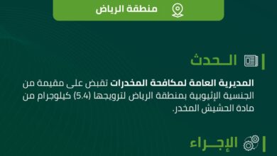 أحوال – متابعات قبضت المديرية العامة لمكافحة المخدرات على مقيمة من الجنسية الإثيوبية بمنطقة الرياض لترويجها (5.4) كيلوجرام من مادة الحشيش المخدر، وجرى إيقافها واتخاذ الإجراءات النظامية بحقها، وإحالتها إلى…