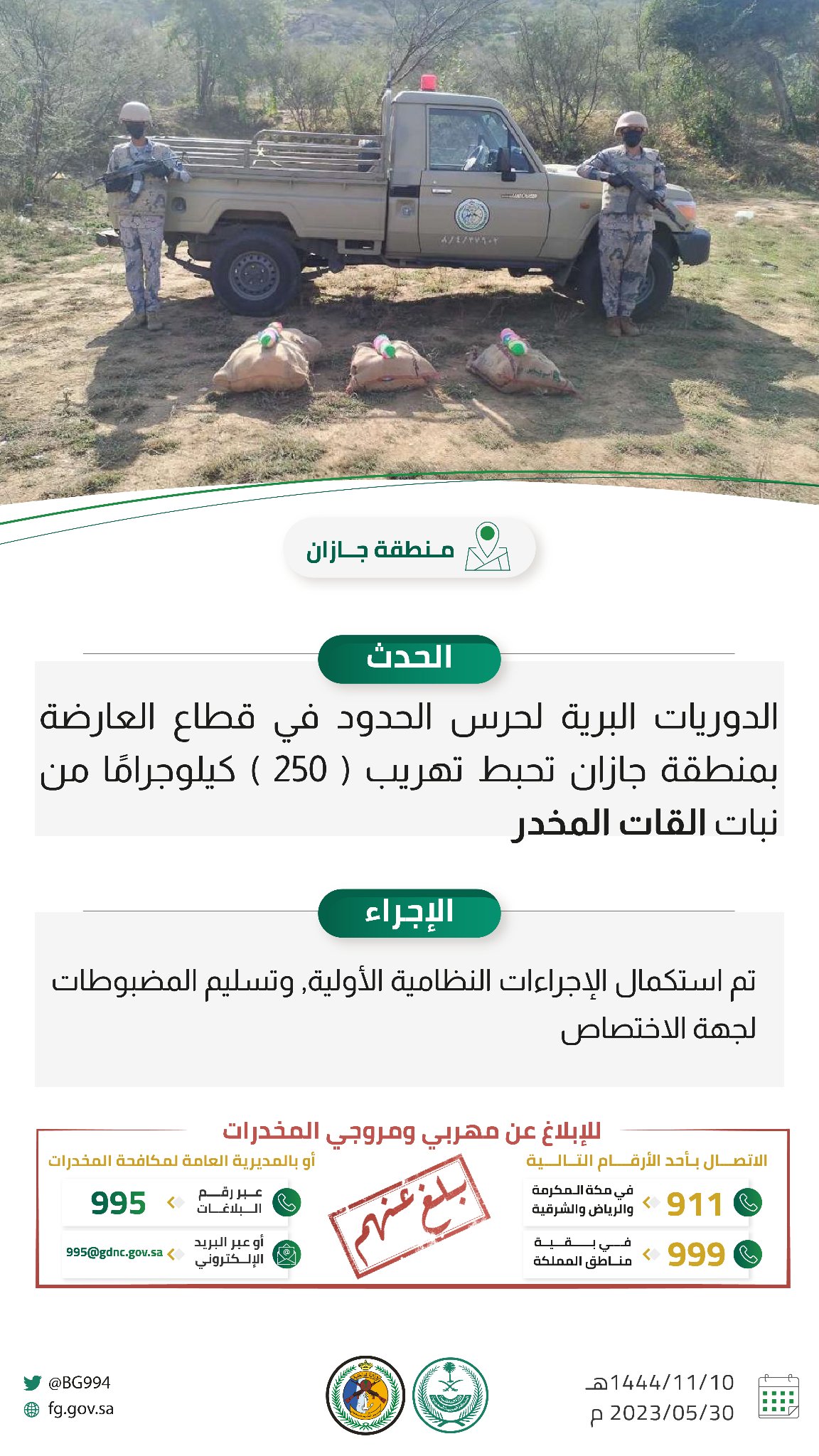تمكن بفضل من الله رجال #حرس_الحدود @BG994 قطاع العارضة بمنطقة جازان من أحباط تهريب (250) كيلوجرامًا من نبات القات المخدر.