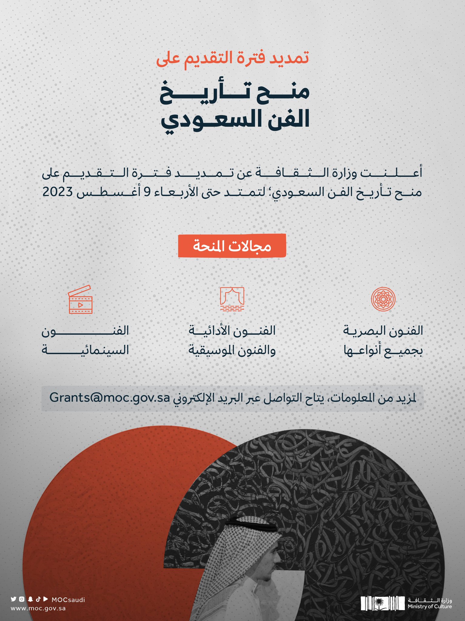 أعلنت وزارة الثقافة تمديد فترة التقديم على منح تأريخ الفن السعودي؛ لرصد نشأة الفنون السعودية وتطوراتها والعوامل المؤثرة فيها والرؤى النقدية والفلسفية والثقافية التي شكّلت الفن في المملكة، حتى يوم الأربعاء 9 أغسطس 2023م، مبينةً أنه يمكن للراغبين في المشاركة التقديم من خلال الرابط التالي https://engage.moc.gov.sa/saudi-art-history-grants.
