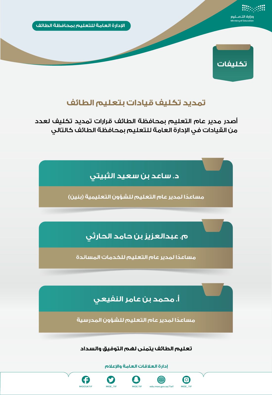 أصدر مدير عام التعليم بمحافظة الطائف الأستاذ الدكتور فهد بن ماجد الشريف قرارات تمديد تكليف لعدد من القيادات في الإدارة العامة للتعليم بمحافظة الطائف كالتالي :-
