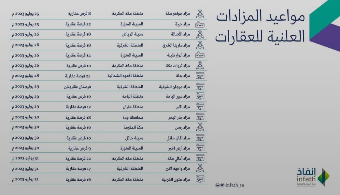 وتبدأ المزادات بمنطقة مكة المكرمة والتي تشمل 5 مزادات منها محافظة جدة لبيع 90 عقارًا في مزاد جار البحر وهتون الغربية الإلكتروني جواهر مكة وثروات مكة ورسن وأعالي مكة الحضوري، ثم منطقة الرياض لبيع 18 عقارًا في مزاد الأصالة الحضوري، ثم منطقة المدينة المنورة في 3 مزادات لبيع 45 عقارًا وتبدأ بمزاد جيرة وأنوار طيبة (الهجين) ومزاد أرض الخير الإلكتروني، ثم المنطقة الشرقية لتشمل 3 مزادات لبيع 37 عقارًا في مزاد مارينا الشرق وواجهة الخبر الحضوري ومزاد مرجان الشرقية الإلكتروني، ثم منطقة حائل لبيع 10 عقارات في مزاد أفاق حائل الإلكتروني، ثم منطقة الحدود الشمالية لبيع 21 عقارًا في مزاد بدنة الإلكتروني، وانتهاءً بمزادين في كلًا من الباحة وجازان لبيع وتصفية 22 عقارًا في مزاد الخير وعبير الباحة الإلكترونيين.