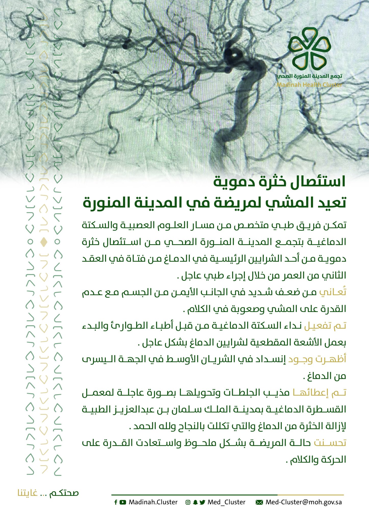 في خبر نشر بموقع تجمع المدينة الصحي عبر “تويتر” أن الفريق الطبي في مدينة الملك سلمان بن عبد العزيز الطبية التابع لتجمع المدينة المنورة الصحي، تمكن بفضل الله من إجراء تدخل جراحي عاجل بعد استقباله شابة مريضة حضرت لقسم الطوارئ تعاني من ضعف شديد في الجانب الأيمن من الجسم، وعدم القدرة على المشي، وصعوبة النطق.