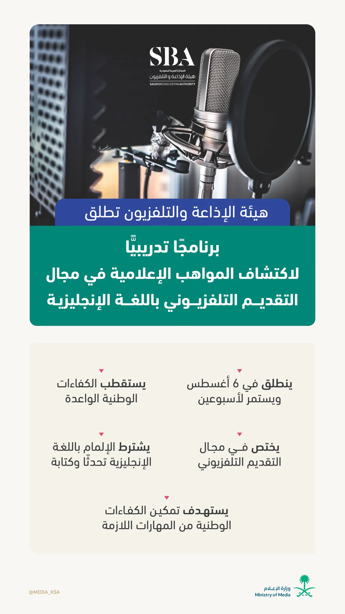 عبر موقع #وزارة_الإعلام @media_ksa #هيئة_الإذاعة_والتلفزيون على الشبكة العنكبوتية x ” تويتر سابقا” ما يخبر المتابعون لقنواتها المسموعة والمرئية أطلاق برنامج تدريبي لاكتشاف المواهب الإعلامية في مجال التقديم التلفزيوني باللغة الإنجليزية.