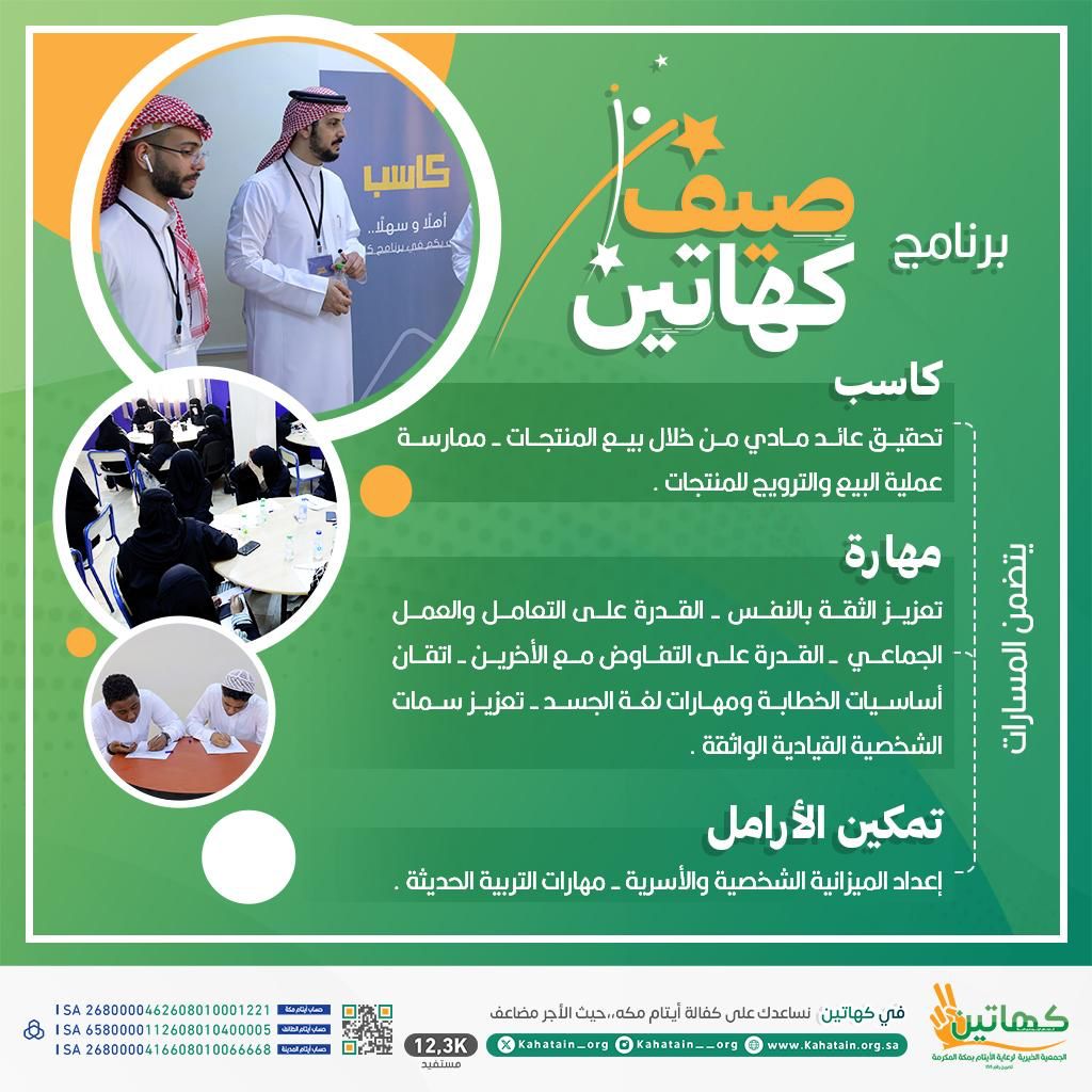 أوضحت الجمعية الخيرية لرعاية الأيتام بمكة المكرمة عن انطلاق برنامج “صيف كهاتين” والذي يرتكز على 3 مسارات ريادية وتنموية للأيتام وأسرهم وهي (كاسب، مهارة، تمكينالأرامل)، ويستمر برنامج “صيف كهاتين” لمدة 23 يوماً وتختتم بمعرض كاسب الذي سيتمكن فيه المستفيدين من عرض مشاريعهمومنتجاتهم في سوق الرواد بأحد مراكز مكة المكرمة التجارية.
