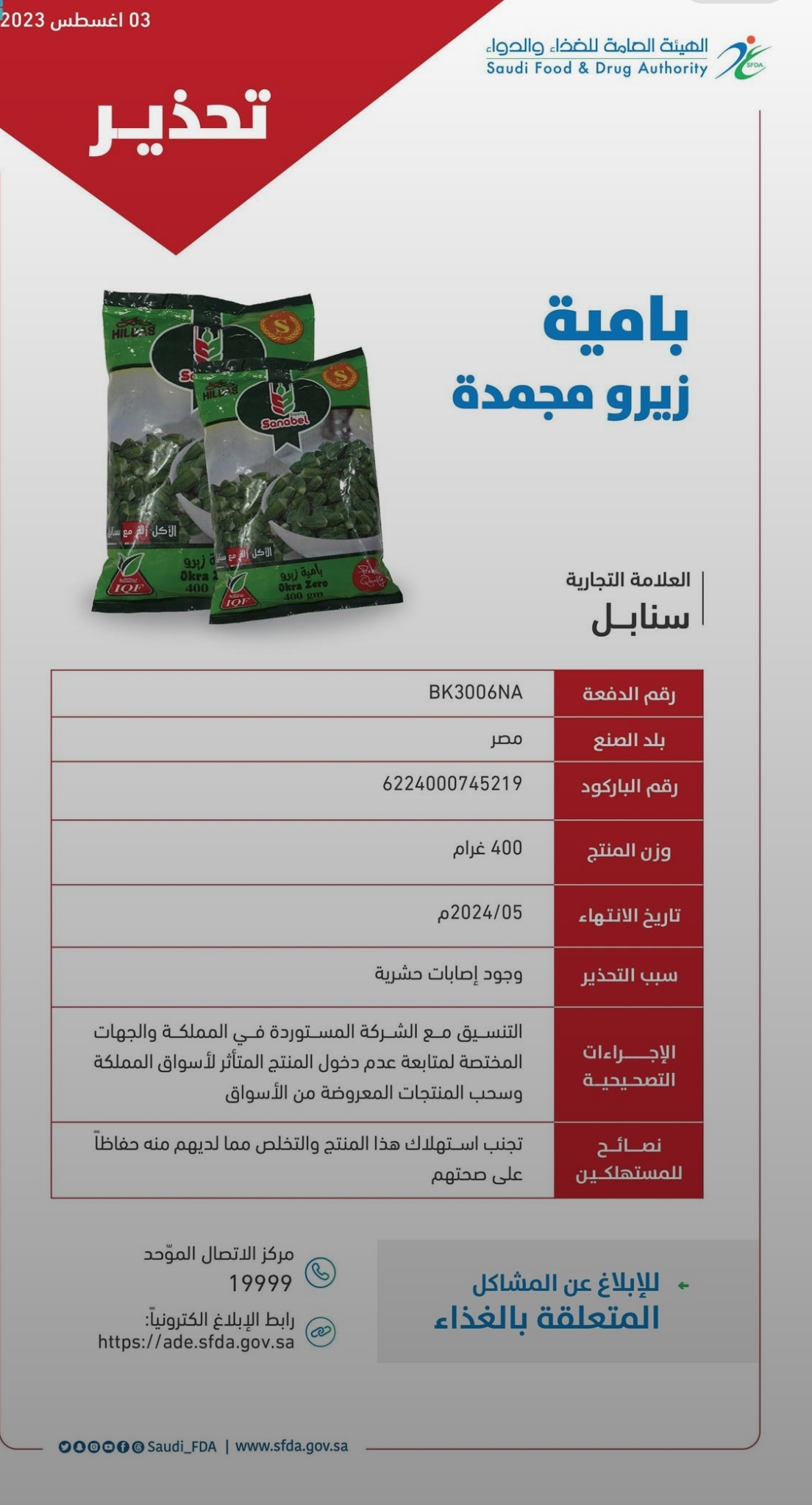 حذّرت الهيئة العامة للغذاء والدواء من استهلاك منتج بامية زيرو المجمدة للعلامة التجارية (سنابل)، الذي يتم إنتاجه في جمهورية مصر العربية، وذلك لوجود إصابات حشرية فيه مما يعد مخالفًا للائحة الفنية “SFDA.FD/GSO 1978” البامية المجمدة.