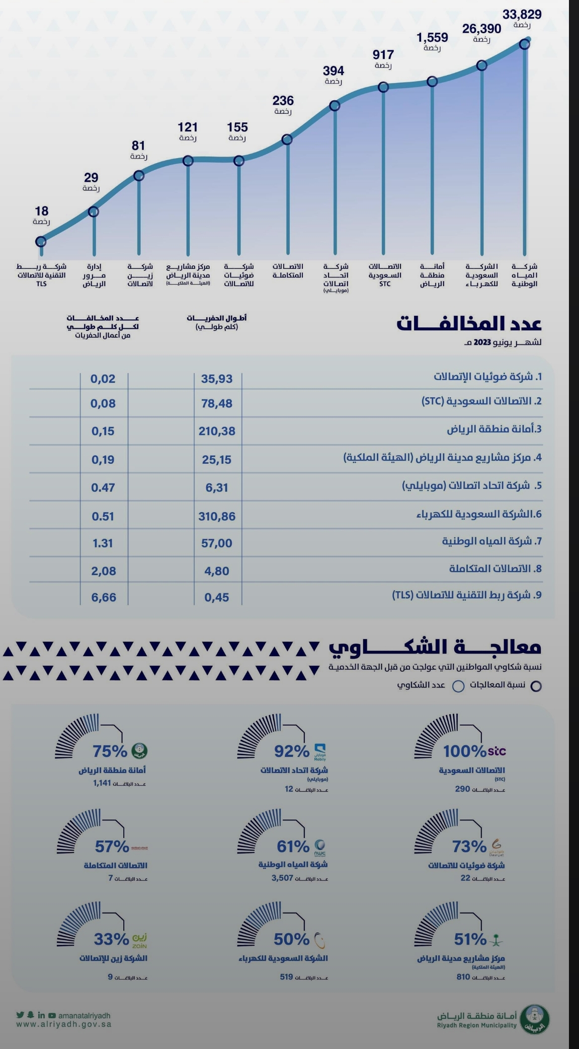 وأوضح التقرير، أن شركة المياه الوطنية تصدرت رخص الحفريات بعدد 33,829 رخصةً، تلتها الشركة السعودية للكهرباء بـ 26,390، ثم أمانة منطقة الرياض بعدد 1,559 رخصةً، الاتصالات السعودية 917، ثم شركة اتحاد اتصالات (موبايلي) بعدد 394 رخصةً، كما شملت قائمة الجهات الخدمية المتصدرة لرخص الحفريات شركة الاتصالات المتكاملة بعدد 236 رخصةً، ثم شركة ضوئيات للاتصالات بـ155، ومركز مشاريع مدينة الرياض بعدد 121 رخصةً، فيما سجلت شركة زين للاتصالات 81 رخصةً، و 29 رخصةً لإدارة مرور الرياض، و18 رخصةً لشركة ربط التقنية للاتصالاتكشف تقرير إحصائي لأمانة منطقة الرياض أن عدد رخص الحفريات الصادرة منذ بداية العام 2023 بلغ 63,827 رخصةً، فيما بلغ عددها في شهر يونيو من العام نفسه 11,021 رخصةً، في حين تصدرت 11 جهة حكومية وخاصة قائمة الأكثر إصداراً للرخص خلال الفترة.