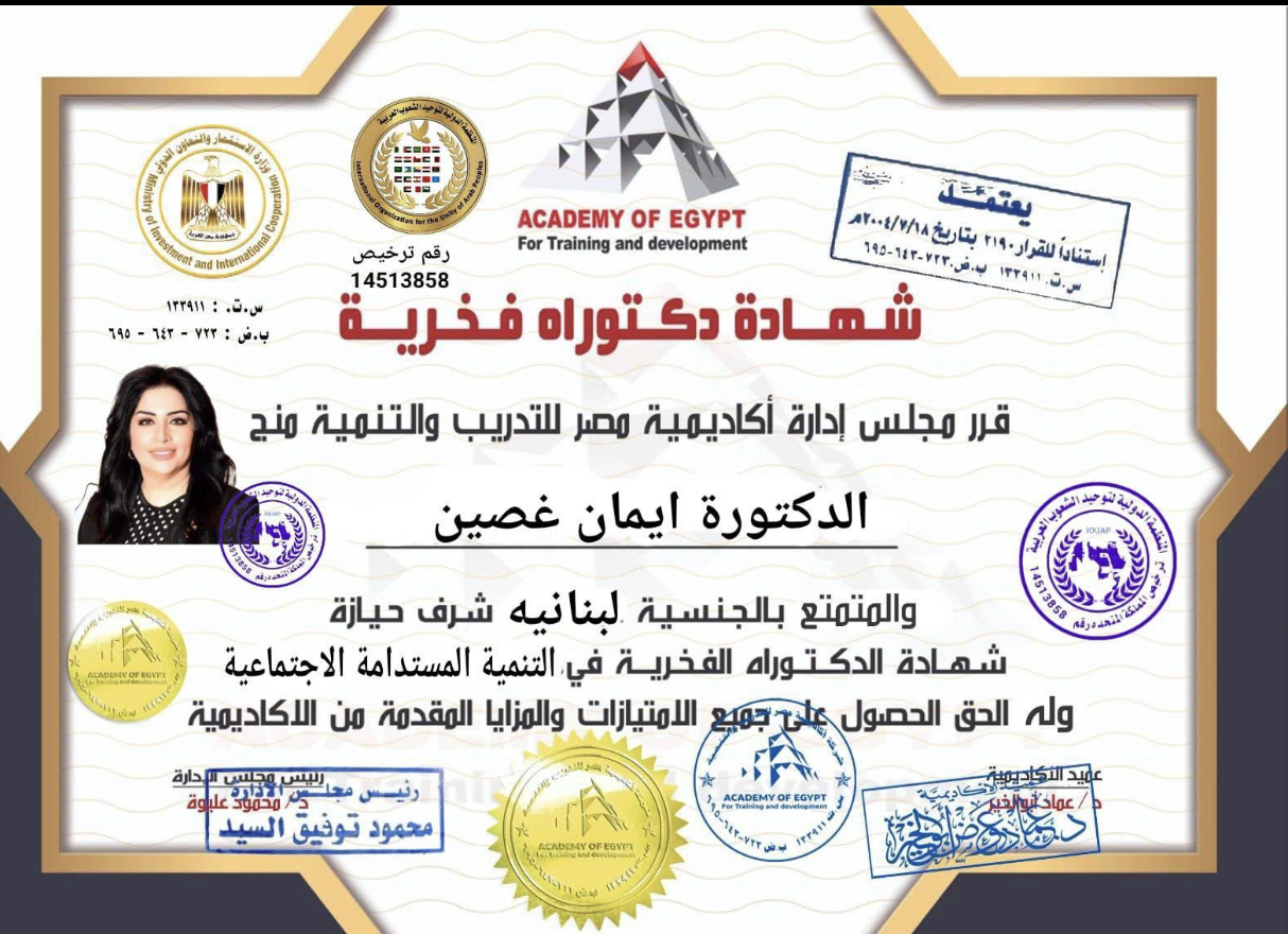 منحت المنظمة الدولية لتوحيد الشعوب العربية شهادة الدكتوراة الفخرية بالتنمية المستدامة للدكتورة اللبنانية ايمان غصين تقديرا لجهودها المتواصله وعطاءاتها الدائمة لخدمة الانسان والانسانيه والبرامج التنموية