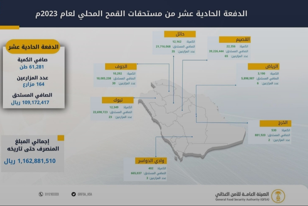 أعلنت الهيئة العامة للأمن الغذائي عن صرف مستحقات الدفعة الحادية عشرة لمزارعي القمح المحلي، شاملة دفعة مستحقي العلاقة التعاقدية بين (المزارعين والشركات الزراعية)، الذين قاموا بتوريد الكميات المخصصة لهم لهذا الموسم 1444/1445هـ (2023م)، وإغلاق حساباتهم عبر المنصة الإلكترونية “محصولي” على الموقع الرسمي للهيئة.