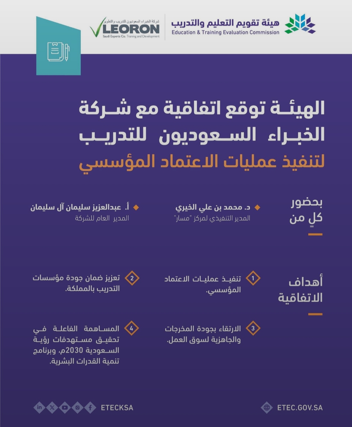 وقع الاتفاقية من جانب الهيئة المدير التنفيذي للمركز الوطني لتقويم واعتماد التدريب “مسار” الدكتور محمد بن علي الخيري، ومن جانب شركة الخبراء السعوديون للتدريب وقعها المدير العام عبدالعزيز سليمان آل سليمان.