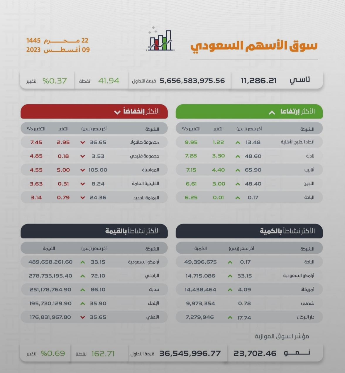 أغلق مؤشر الأسهم السعودية الرئيس اليوم مرتفعًا 41.94 نقطة ليقفل عند مستوى 11286.21 نقطة, وبتداولات بلغت قيمتها 5.6 مليارات ريال.