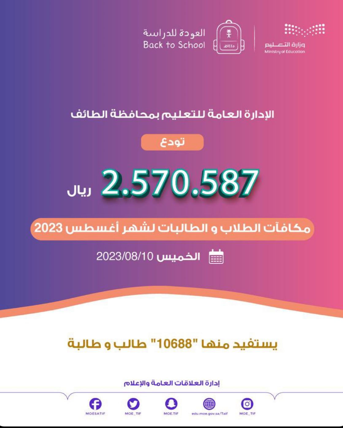 تبدأ إدارة تعليم الطائف يوم غدٍ الخميس في إيداع مكافآت الطلاب والطالبات لشهر اغسطس 2023 م بمبلغ إجمالي يتجاوز ( 2570587) ريال يستفيد منها ( 10688) طالبًا وطالبة في مراحل التعليم المختلفة