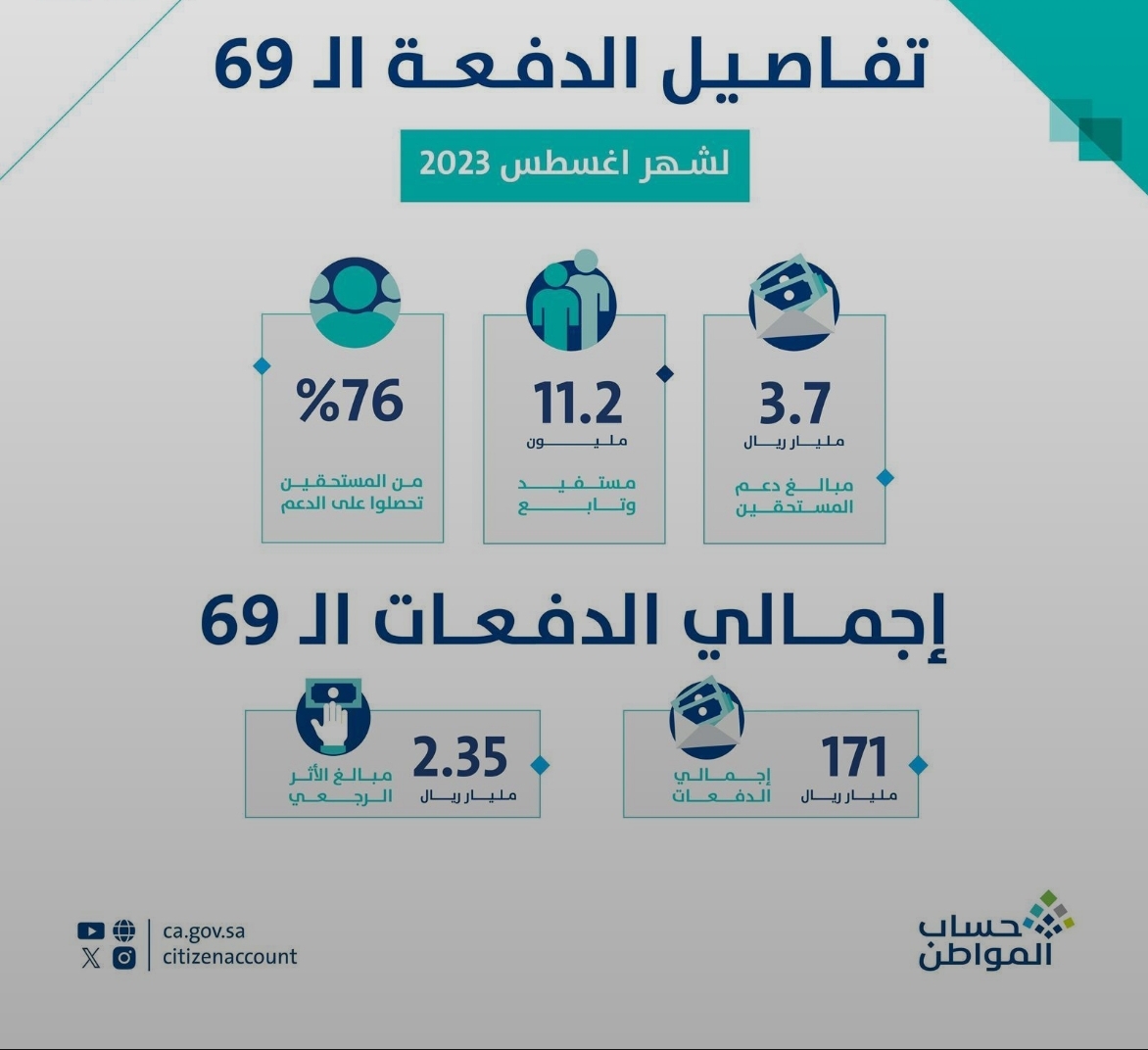 وأفاد مدير عام التواصل لبرنامج حساب المواطن عبدالله الهاجري، أن إجمالي ما دفعه البرنامج للمستفيدين منذ انطلاقته أكثر من 171 مليار ريال، منها 2.35 مليار ريال تعويضات عن دفعات سابقة، موضحًا أن 76% من المستفيدين تحصلوا على الدعم في هذه الدفعة، فيما بلغ متوسط دعم الأسرة الواحدة 1827 ريالاً.