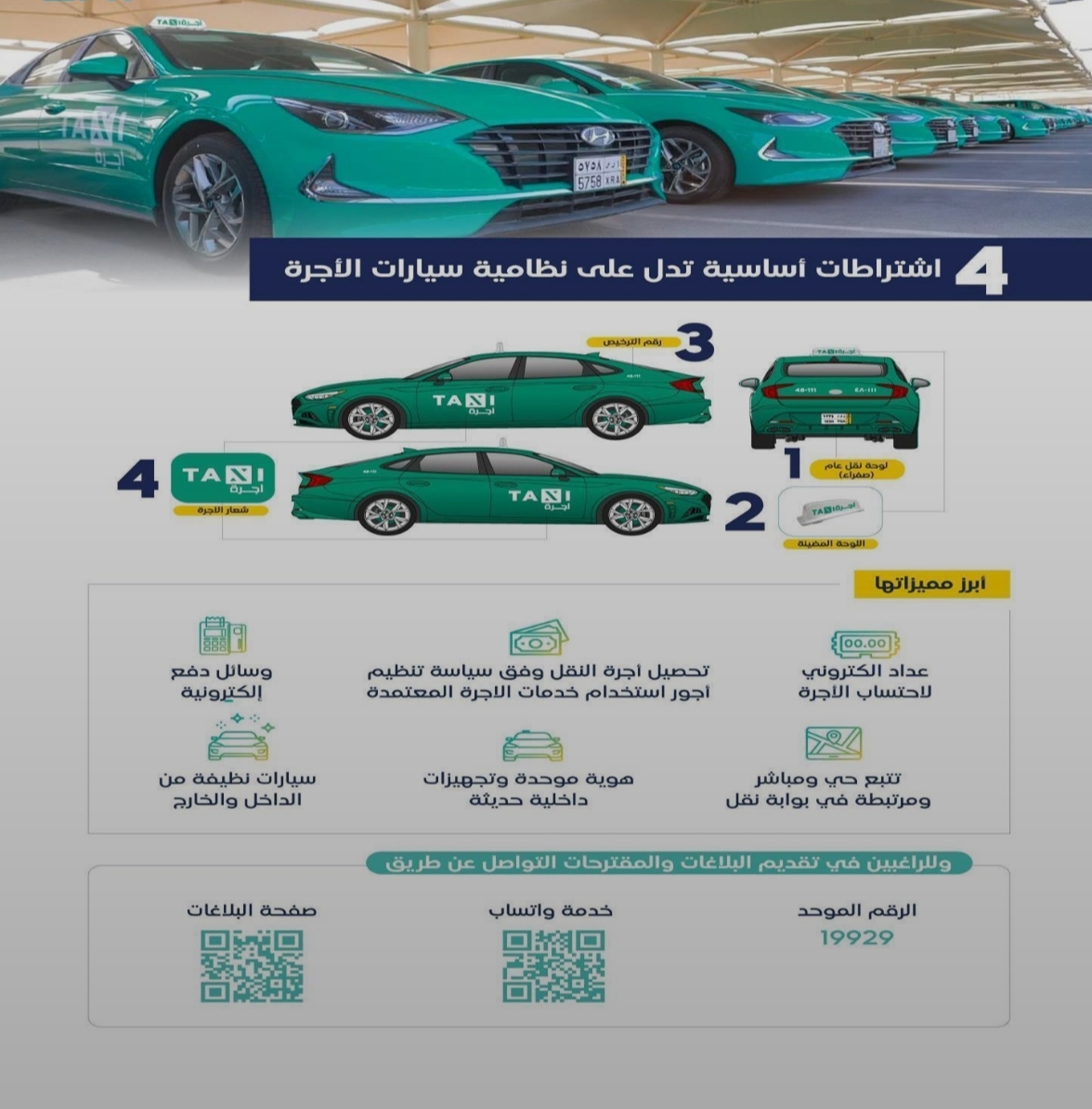 أكدت الهيئة العامة للنقل ضرورة التعامل مع سيارات الأجرة النظامية، التي تلتزم بتطبيق معايير واشتراطات اللائحة المنظمة لنشاط الأجرة ووسيط الأجرة والتوجيه، واستيفاء المتطلبات والمواصفات الفنية المحددة للسيارات، والحاصلة على التراخيص اللازمة لممارسة النشاط، بما يسهم في رفع مستوى جودة الخدمة، وفق أعلى معايير ومتطلبات السلامة.