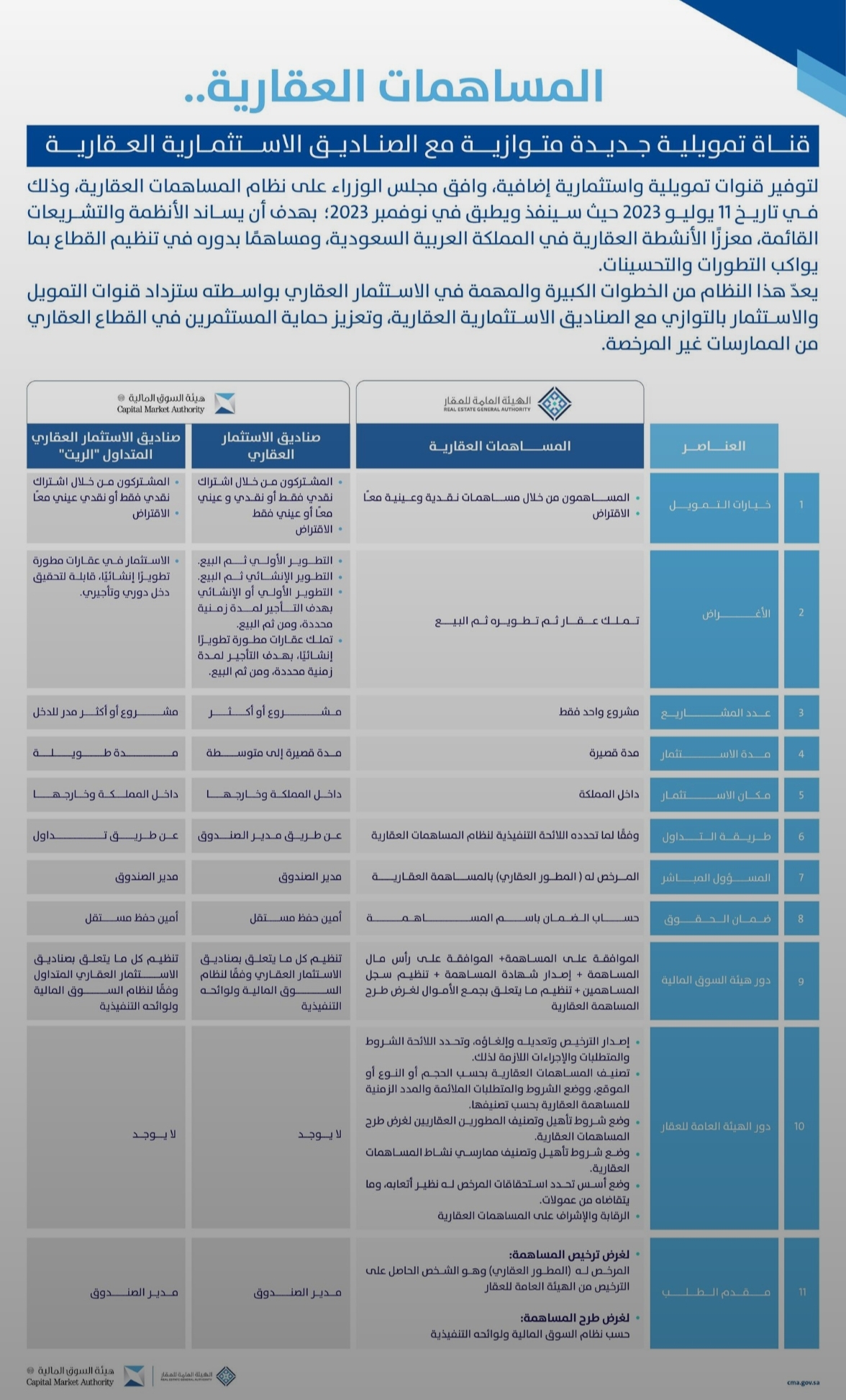 بدوره أوضح المتحدث الرسمي للهيئة العامة للعقار تيسير المفرج أنَّ النظام والذي جاء ضمن منظومة التشريعات العقارية التي تشرف عليها “هيئة العقار “، يهدف إلى تنظيم نشاط المساهمات العقارية، وإلى رفع مستوى الشفافية والإفصاح فيه، وإلى حماية حقوق جميع أطراف المساهمة العقارية، وفتح قنوات تمويلية جديدة للمستثمرين في مجال التطوير العقاري، ويعزز الثقة في القطاع من خلال تنظيم إجراءات طرح وإدارة وتصفية المساهمات العقارية، ويساهم بإذن الله في زيادة المعروض من المنتجات العقارية المطورة بما يخدم السوق العقاري، ويواكب زيادة الطلب خاصة في القطاع السكني.