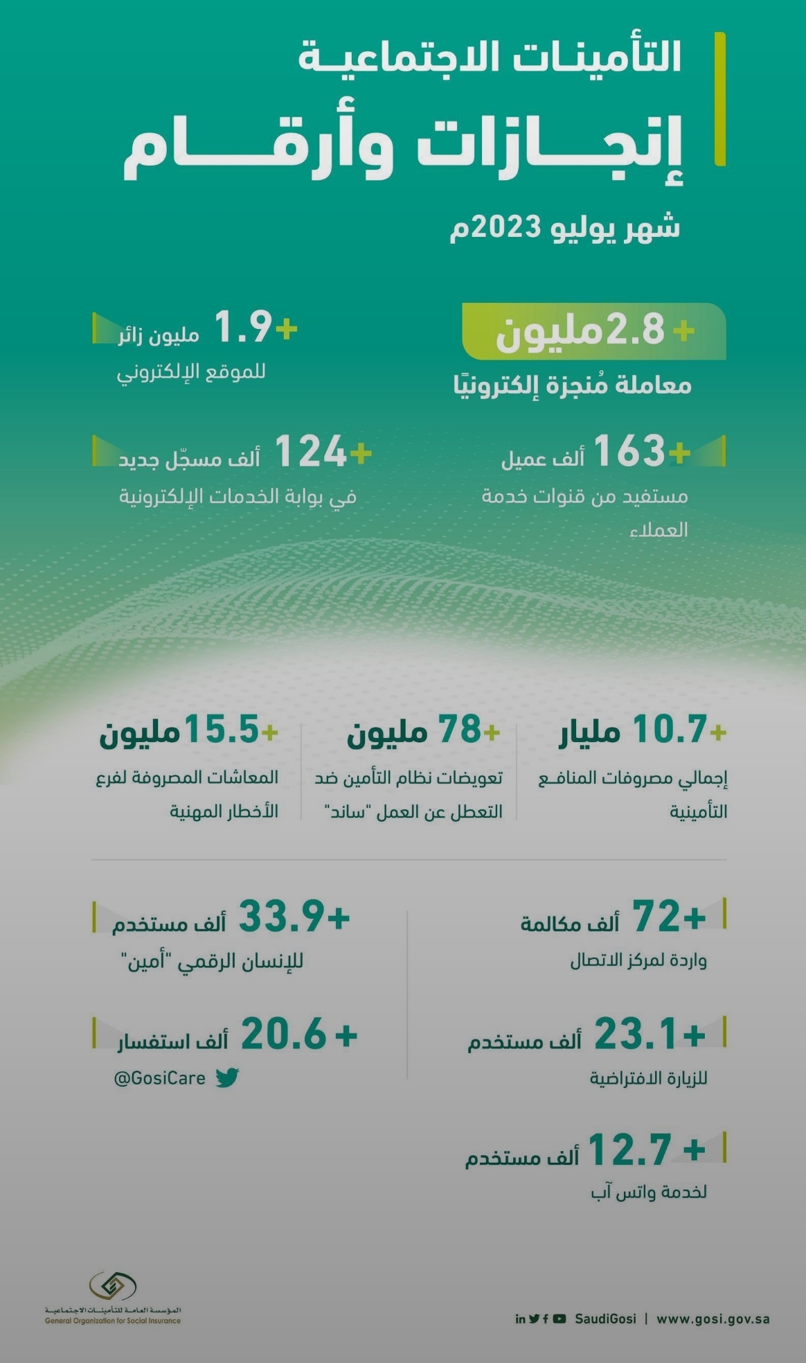 وبينت المؤسسة في نشرتها الدورية الشهرية، أنه تم خلال الفترة من 1 – 31 يوليو 2023م إنجاز أكثر من 2.8 مليون معاملة إلكترونية، فيما بلغ عدد زوار الموقع الإلكتروني للمؤسسة أكثر من 1.9 مليون زائر، بينما تخطى عدد المسجلين الجدد في البوابة حاجز الـ 124 ألف مستخدم.