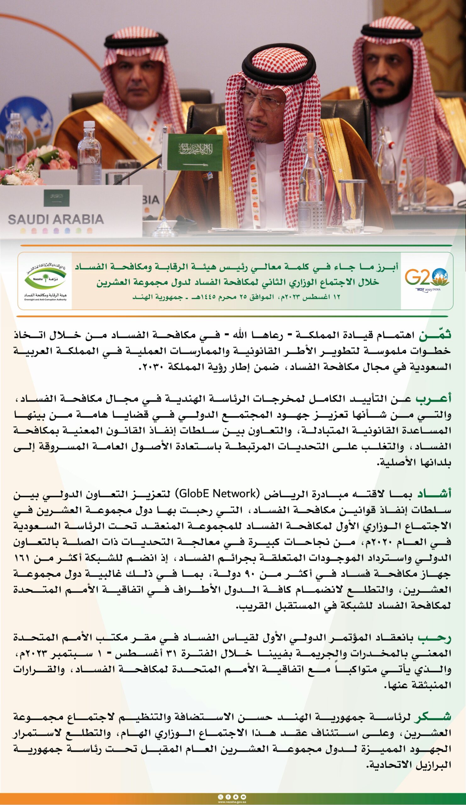 وأشاد رئيس الهيئة بما لاقته مبادرة الرياض Globe Network لتعزيز التعاون الدولي بين سلطات إنفاذ قوانين مكافحة الفساد التي رحبت بها دول مجموعة العشرين في الاجتماع الوزاري الأول لمكافحة الفساد للمجموعة المنعقد تحت الرئاسة السعودية في العام 2020م من نجاحات كبيرة في معالجة التحديات ذات الصلة بالتعاون الدولي واسترداد الموجودات المتعلقة بجرائم الفساد، إذ انضم للشبكة أكثر من ١٦١ جهاز مكافحة فساد في أكثر من ٩٠ دولة بما في ذلك غالبية دول مجموعة العشرين والتطلع لانضمام كافة الدول الأطراف في اتفاقية الأمم المتحدة لمكافحة الفساد للشبكة فى المستقبل القريب.